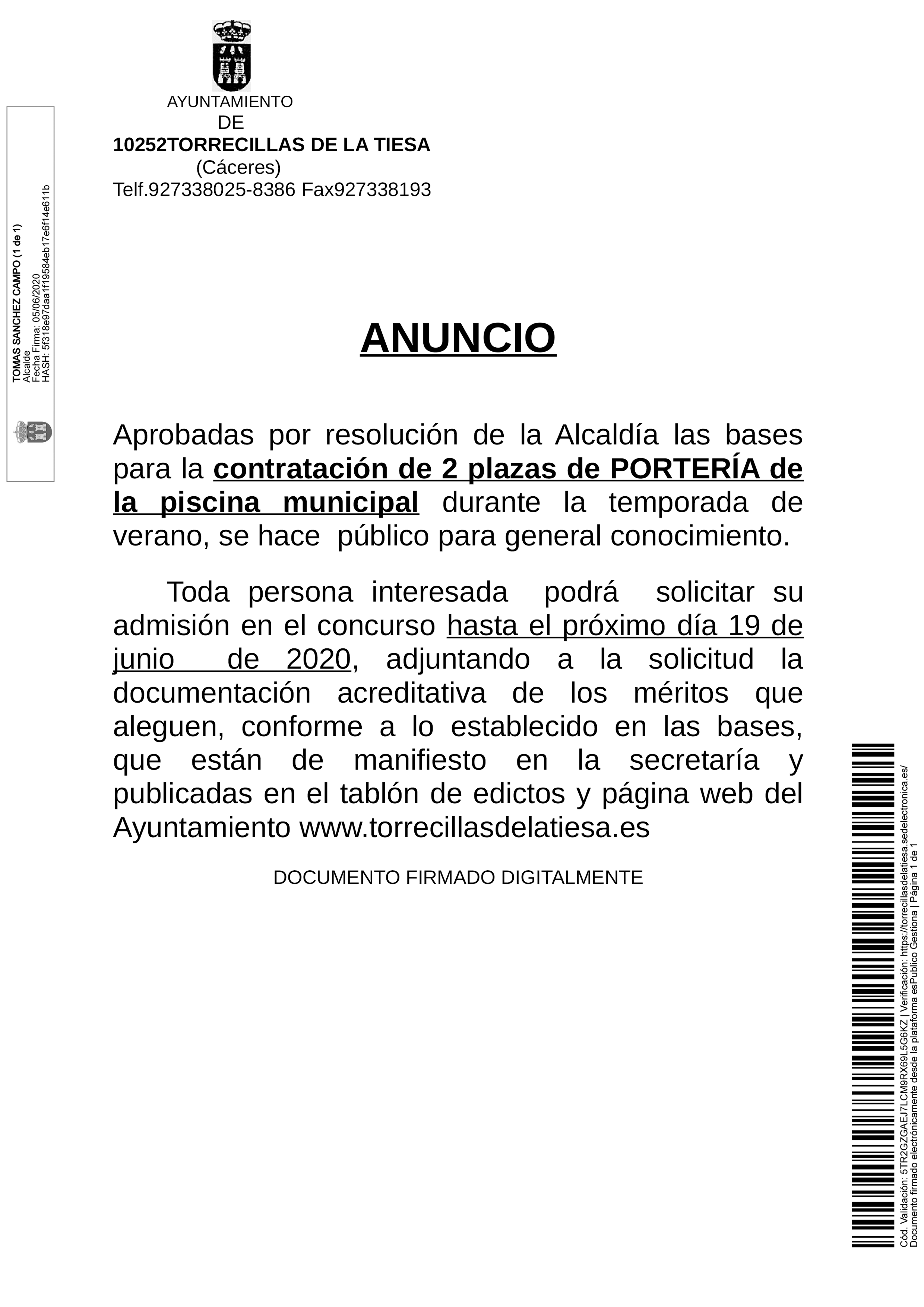 2 PLAZAS PORTERÍA PISCINA MPAL 05 junio 2020 Documentos BASES portería (pdf 319,2 kB)solicitud porteros (docx 15,5 kB)
