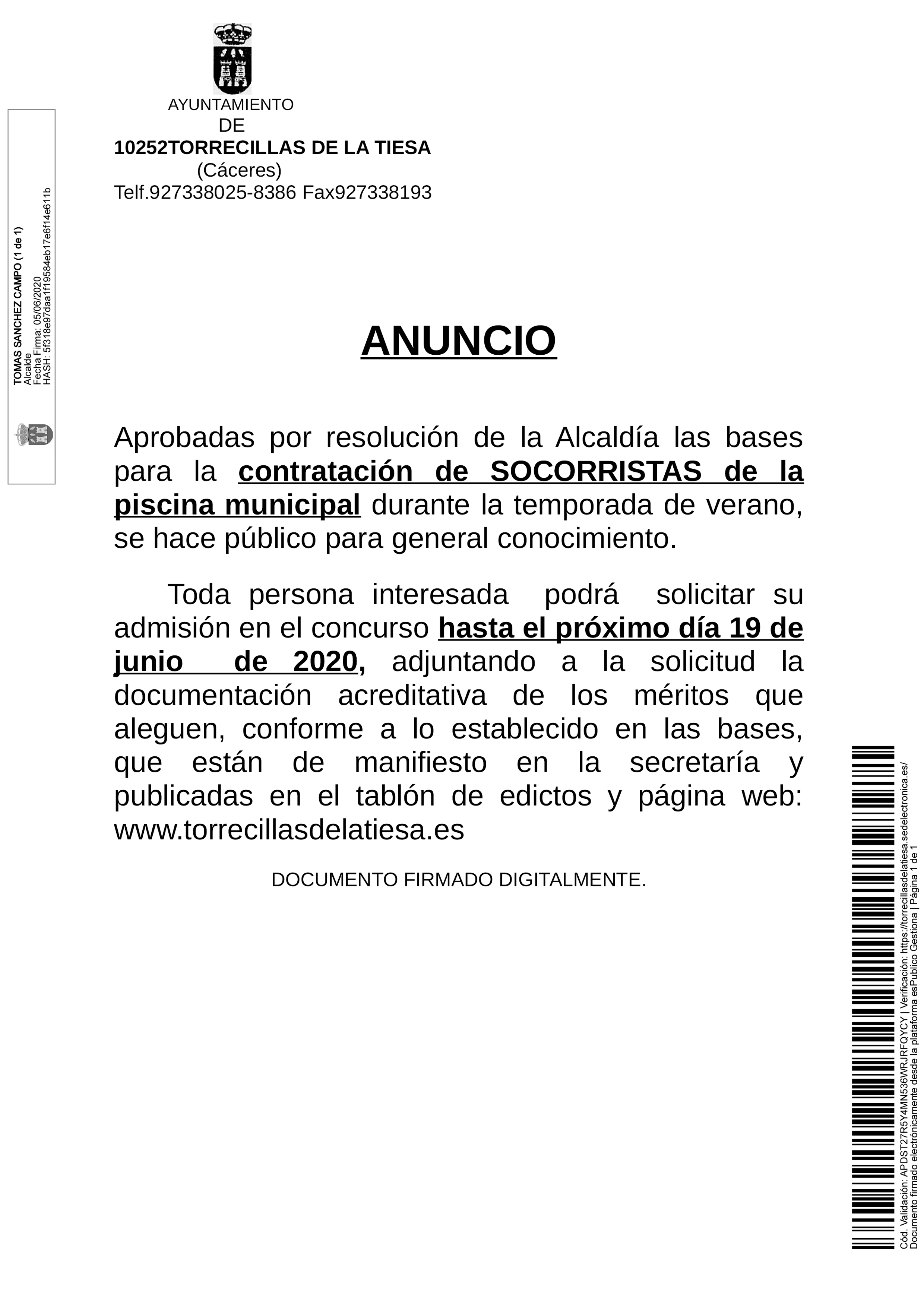 2 PLAZAS SOCORRISTAS PISCINA MPAL 05 junio 2020 Documentos BASES SOCORRISTAS (pdf 337,1 kB)solicitud socorristas (doc 25,5 kB)